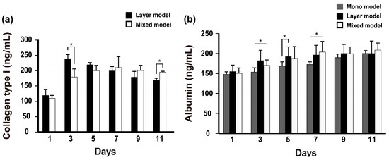 Albumin and collagen type I secretion from the experimentally designed models. (n = 3, * p < 0.05).