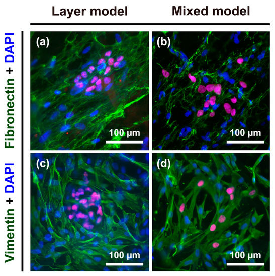 To further explore the phenotypic changes occurring in Hep G2 cells, the expression of fibronectin as an ECM protein, and vimentin as a cytoskeletal marker, in the progression of EMT was detected in the layer model and mixed model. Both fibronectin and vimentin are considered to be general mesenchymal makers acquired during EMT [23,24]. After seven days of culture, fibroblasts specifically showed strong expression of both fibronectin and vimentin (Figure 5), whereas Hep G2 cells were vaguely stained: fibronectin and vimentin were more greatly expressed in the mixed model (Figure 5b,d) than layer model (Figure 5a,c).
