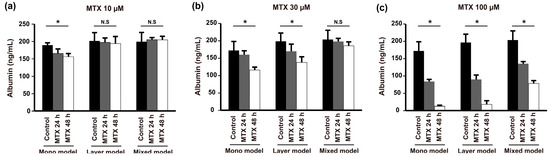 Anticancer drug resistance of Hep G2 cells determined in the mono model, layer model, and mixed model by measuring albumin secretion with increasing concentrations of MTX: (a) 10 µM; (b) 30 µM; and (c) 100 µM after 24 and 48 h. (n = 3, * p < 0.05, N.S = not significant).
