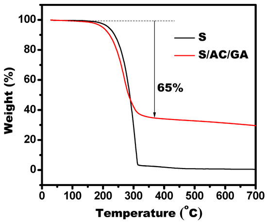 Figure 4 displays the TGA curves of S and S/AC/GA. The S/AC/GA composite loses about 65% of its weight at 200 °C, which is due to evaporation of sulfur. Achieving such a high sulfur content in the S/AC/GA composite could be possible due to benefits of its porous structure. The ratio of AC/GA composite and sulfur equal to 1:2 can satisfy the requirements for sulfur content in the cathode to enable achieving a high capacity performance. Furthermore, this value corresponds to the ratio of the components used to prepare the composite, i.e., the sulfur loss upon preparation was minimal. It can be concluded that the 3D hierarchical porous structure of the as-prepared S/AC/GA composite is beneficial for increased sulfur content in the electrode and, consequently, for enhanced energy storage.