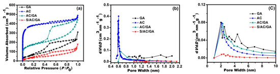 (a) N2 adsorption/desorption isotherms, (b,c) Pore size distributions of GA, and AC, AC/GA, and S/AC/GA composites, respectively.