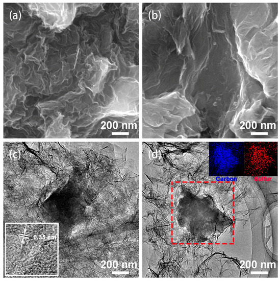 SEM images of AC/GA (a) and S/AC/GA composites (b), and transmission electron microscopy (TEM) images of AC/GA (c) and S/AC/GA composites (d); Inset of (c) is high-resolution transmission electron microscopy (HRTEM) of S/AC/GA composite; Insets of (d) is elemental (carbon, sulfur) mapping of S/AC/GA composite.