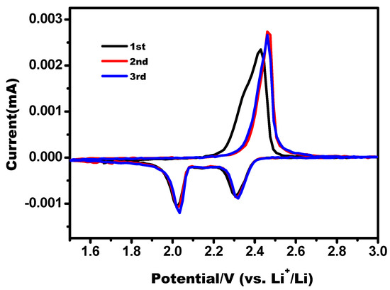 Figure 7 shows the CV curves of the S/AC/GA composite at a scan rate of 0.1 mV s−1. Two main cathodic peaks at ~2.3 V and ~2.1 V and an obvious anodic peak at ~2.3 V correspond to reversible reduction and oxidation of sulfur, respectively. A reduction peak at 2.3 V is related to conversion of S8 to soluble higher-order lithium polysulfide species (Li2Sn, 4 ≤ n ≤ 8) during the discharge process [20,21]. The next peak at ~2.1 V could be attributed to the further reduction of lithium polysulfides into insoluble Li2S2 and Li2S on the surface of the cathode [6,16]. An oxidation peak at ~2.3 V is ascribed to conversion of Li2S2 and Li2S into lithium polysulfides, and further to elemental sulfur. No remarkable changes in the shape and position of the redox peaks can be detected in the initial three cycles, reflecting a high electrochemical stability and reversibility of the S/AC/GA composite [22].