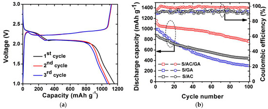 (a) Discharge/charge profiles of cell with S/AC/GA composite electrode at 0.1 C; (b) Cycle performance of S/AC, S/GA, and S/AC/GA composite electrodes within a potential range from 1.0 V to 3.0 V at a current rate of 0.1 C.