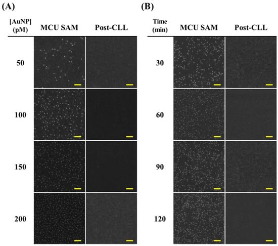 The following are available online at http://www.mdpi.com/2079-4991/8/2/71/s1, Figure S1: Water contact angle measurements of MCU SAM-modified Au substrates under different stamp seal time treatments in the CLL process. (N = 3); Figure S2: Au nanoparticle densities on the CLL-treated substrates corresponding to SEM images shown in Figure 3. The CLL process is operated under the 24 h stamp seal time condition. (A) 1 h of nanoparticle deposition time is fixed with changing solution concentrations. (N = 4); (B) 150 pM of nanoparticle suspension solution is used with various deposition times. (N = 4).