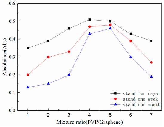 Figure 2 shows the measured absorbance of nanofluid with different mass ratios of PVP to GNPs after standing for different amounts of time (i.e., two days, one week, or a month). The specific wavelength for measurement in this study was 400 nm. It is evident that when the mass ratio of PVP to GNPs was between 4 and 5 PVP/GNPs, the absorbance values were largest. This indicates that graphene/water nanofluid with this mass ratio of PVP dispersant (i.e., 5 g PVP for every 1 g GNPs) could obtain better suspension stability. According to the optimum dispersant addition, nanofluid with four different GNPs concentrations of 0.01, 0.025, 0.05 and 0.075 wt % were prepared for further research. Figure 1c shows the prepared graphene/water nanofluid with different GNPs concentrations.