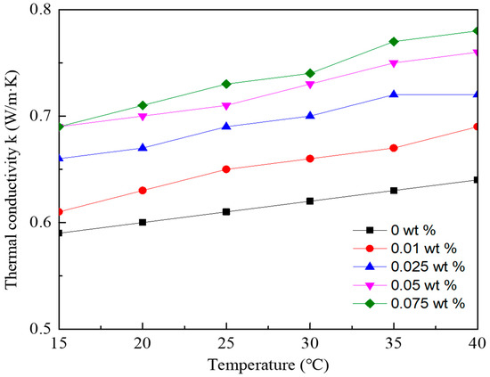 Figure 3 shows that the thermal conductivities of both the graphene/water nanofluid and the deionized water increase with the increase of temperature. Meanwhile, the thermal conductivity of nanofluid increases as the GNPs concentration increases. For the nanofluid with a GNPs concentration of 0.075 wt %, the thermal conductivity reaches 0.71 W/(m·K), which is 18.6% higher than that of deionized water at the same temperature of 20 °C.