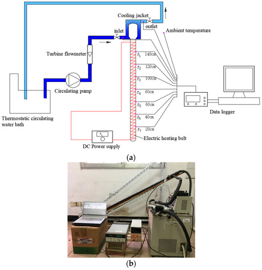 Figure 5 shows the schematic and experimental setup of the start-up characteristics testing for a single solar gravity heat pipe using deionized water as the working fluid. The experimental system mainly includes a single solar gravity heat pipe, thermostatic circulating water bath, electric heating belt and insulation material, direct-current power supply, circulating pump, plastic hose, data logger and computer. To simulate the actual working conditions for solar collection, the evaporation section of the heat pipe was heated using a tightly bound insulated electric heating belt. The operating characteristics of the heat pipe were investigated under different solar radiation levels by adjusting the heating power. Several T-type thermocouples with measuring accuracy of ±0.5 °C were adhered to the outer wall of the pipe for measuring the wall temperature at different height positions. The outside surface of the evaporation section was thermally insulated for preventing the heat loss to the ambient. The condensing heat was released to the water circulated from a thermostatic water bath to the cooling jacket of the condensing section. During the experiment, the water temperature was controlled at a given value with a fluctuation of less than ±0.5 °C.