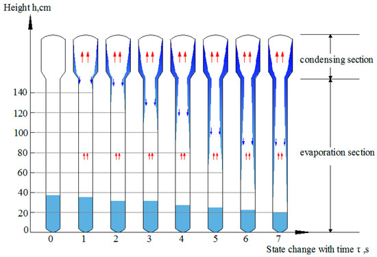 After the power supply was turned on for a period of time, the heat pipe started up to work. The principle of the start-up process for the experimented solar gravity heat pipe is shown in Figure 6. It is outlined as follows. The initial liquid pool height inside the heat pipe in state 0 is approximately 37.15 cm as regard to a filling rate of 18%. At the beginning of heating, there is little condensate due to the little vaporized steam and this floats upwards. With continuous heating in the evaporation section, the amount of vaporized steam inside the heat pipe increases and releases heat to the water in the condensing section. Consequently, the amount of condensed reflux liquid increases. When the reflux liquid flows to a height of 140 cm, as shown in state 1, the wall temperature at this height suddenly drops to the level of the condensing temperature. Similar to what is described above, the condensate reflux liquid gradually flows through the heights of 120, 100, 80, 60 and 40 cm and the resultant temperatures sequentially drop to the levels of the corresponding condensing temperatures as heating goes on. When it finally flows to the height of 20 cm, the amount of vaporized steam and condensate reaches a steady state 7 without any change. The heat pipe thus completes the start-up process.