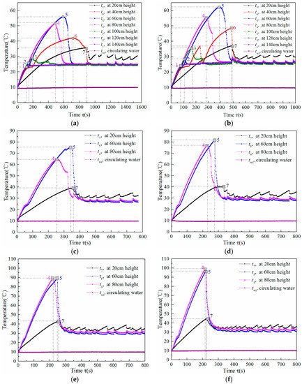 The variations of pipe wall temperatures at different heights after different heating time during the start-up period was experimentally investigated and the results are shown in Figure 7. This verified the aforementioned start-up process of the heat pipe. Figure 7a shows the variations of pipe wall temperature as the heat pipe operates with a heating power of 20 W. When the heating is started, the wall temperatures at the different heights increase rapidly. This is because most of the input heat is used to heat the pipe wall and the initial liquid pool height inside the heat pipe. As the heating continues, vaporized steam increases and floats up to the condensing section. Then, the condensate flows back down. When the condensed reflux liquid flows to the height of 140 cm, the temperature at this height (t1) encounters the inflection point 1 shown in the figure, sharply drops in temperature to match the condensate temperature and then remains at that temperature. After this, the wall temperatures at the evaporation section from top to bottom reflect their corresponding inflection points in the order of point 2, 3, 4, 5, 6 and 7. Before the time point 7 is reached, the heat pipe completes the start-up and later works in a steady state. As the height of 20 cm is near the liquid pool inside the heat pipe, the wall temperature at this height (t7) has certain fluctuations. Figure 7b–f shows similar variation tendencies of pipe wall temperatures when the heat pipe was operated under different heating power conditions. Only parts of the heat pipe wall temperature curves were illustrated in the figures for brevity.