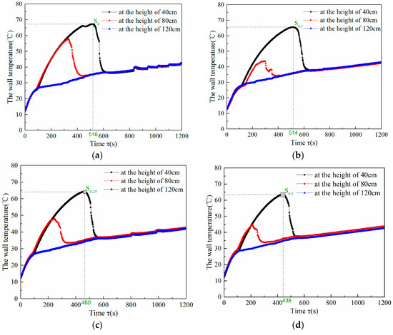 Based on the principle presented in Section 3.2.2, the heat pipe’s start-up time (∆τs) was defined as the time when inflection point 7 appeared. When the heating power was 20, 30, 40, 50, 60 and 70 W, the starting time of the heat pipe was 890, 490, 356, 334, 248 and 226 s, respectively. The start-up time was shortened with the increase of heating power. That is, a lower solar radiation operation requires a longer time to start up. In addition, there is a sudden increase in the wall temperature during the start-up period. The maximum wall temperature (ts) corresponding to the given heating power levels was 55.7, 62.0, 75.5, 81.9, 89.0 and 97.1 °C, respectively.
