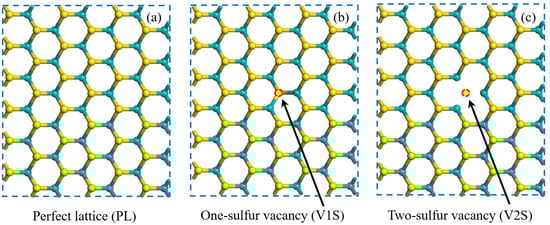 The top view of the atomic configurations of monolayer MoS2: (a) perfect lattice (PL) structure, (b) one-sulfur vacancy (V1S) structure, and (c) two-sulfur vacancy (V2S) structure.