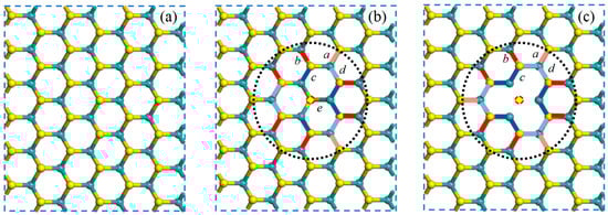 Compared to the perfect supercell model, there is little change in the lattice constant in the supercell containing vacancies after relaxation, indicating that a small amount of vacancy does not produce a significant impact on the crystal structure; however, the bond length around the vacancy is slightly different. Table 1 lists the lengths of the bonds of V1S and V2S of monolayer MoS2 before and after structure relaxation compared with perfect MoS2 in which a, b, c, d, and e represent the distance between the two adjacent Mo–S atoms in the sandwich layer around the vacancy. It is intuitively clear that ions surrounding S vacancies appear with slight inward relaxation because of the absence of sulfur atoms. For S vacancies in Figure 3b,c, the inward relaxations of the nearest Mo ions are larger than those of the other Mo ions [21]. The phenomenon can be explained by the redistribution of electrons. Compared with perfect MoS2, the adjacent S–Mo bond change is slightly larger than the sub-adjacent one, which conforms to the lattice distortion of a point defect.