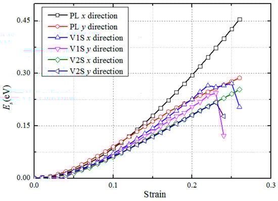 The per-atom strain energy Es of PL, V1S, and V2S monolayer MoS2 sheet versus tensile strain in the x- and y-directions.