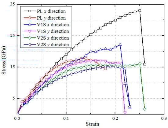 From Figure 5 it can be found that along the x-direction both the maximum stress and its corresponding strain are higher than those along the y-direction. The ultimate strength for a perfect lattice in the x-direction is larger than that in the y-direction [6]. In addition, the S-vacancy defects reduce the energy of the system. Compared with the PL MoS2 sheet, the S-vacancy MoS2 sheets reach the yielding point more quickly and, moreover, the yielding point of x is higher than the y-direction. In addition, for the V1S case, the symmetry is destroyed due to the sulfur vacancy and the oscillation occurs at the yielding point in the x-direction until the failure point is reached. In contrast, V2S reaches steady growth after reaching the yielding point until it reaches a point of failure. As shown in Table 2, the existence of a vacancy lowers the strength and stiffness of the material. The effects of orientation and sulfur defects on Young’s modulus and ultimate stress are not obvious. Moreover, Bertolazzi et al. have approximately obtained Young’s modulus of monolayer MoS2, which is equal to 270 ± 100 GPa [4]; Castellanos–Gomez et al. calculated the average of monolayer molybdenum disulfide to be around 330 ± 70 GPa using atomic force microscopy (AFM) [25]. Therefore, the simulation results of Young’s modulus in the present study agree well with the experimental data.