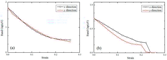 Strain modulation has been commonly used in low-dimensional systems to tune the electronic structures and band gaps. We further calculated the band gap of monolayer MoS2 sheets with two different types of sulfur-vacancy defects influenced by strain in the x- and y-directions, as shown in Figure 6. It can be found that the band gaps of the three cases—including PL, V1S, and V2S—decrease gradually as the tensile strain increases. The tendencies in the x- and y-directions are basically the same; the only difference is that the band gap of the monolayer MoS2 with sulfur vacancy defects will be reduced to zero. As shown in Figure 6, the calculated direct band gap for perfect monolayer MoS2 is about 1.77 eV at zero strain, which is consistent with the experimental value (1.90 eV [26]) and theoretical values (1.80 eV [27], 1.70 eV [28]). Both the V1S and V2S monolayer MoS2 sheets behave as semiconductors with band gaps of 0.72 eV and 0.73 eV, respectively. The reason why they changed a lot compared to the perfect one (PL) is mainly that the sulfur vacancy defect makes the original band gap impure.