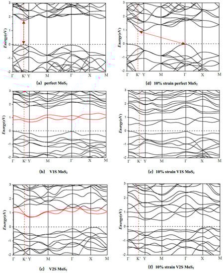 Considering the tensile strain, the electronic property of the perfect and S-vacancy MoS2 are revealed through investigating their band structures, which are shown in Figure 7. From the band structure, it is found that the presence of sulfur vacancies leads to the introduction of new energy bands near the Fermi level and the hydrogen adsorption on the S-vacancies may be the reason for it. Because of the introduction of the sulfur vacancy, the direct band gap of monolayer MoS2 has been changed into an indirect band gap, which is due to the contraction of the neighboring atoms of S-vacancy; a local state or transition state occurs between the VBM and CBM [10,19]. A defect energy band is introduced (red line). The direct band gap of monolayer MoS2 has been changed into the indirect band gap, which is due to the contraction of the neighboring atoms of the S-vacancy. A local state or transition state occurs between the VBM and CBM [10,19].