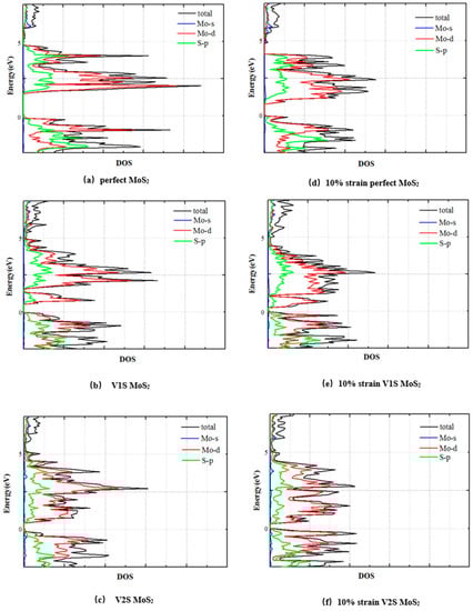 Figure 8 shows the density of states (DOS) of the PL, V1S, and V2S monolayer MoS2 and their 10% strain under the uniaxial tension in the x-direction. For the perfect monolayer MoS2, as well as one with defects, CBM and VBM are mainly composed of S-p orbitals and Mo-d orbitals. At the same time for V1S and V2S defects of MoS2, as shown in Figure 8a–c, taking V1S as an example, the existence of a transition state that reduces the band gap is mainly due to the interaction above the Fermi level of the S-p and Mo-d orbitals. The main reason for the transition state is that the sulfur vacancy causes contraction of the Mo–Mo bond around the defect. At the same time, the highly symmetric bond structure of S–Mo–S forms the role of a weak bond-like interaction, which is extremely sensitive to strain, resulting in a significant change in the energy band structure once the strain is applied. As shown in Figure 8d–f, after the strain is applied, the DOS around the Fermi level changes significantly and the variation of the S-p orbit is more obvious than that of the Mo atomic orbital. The PL MoS2 sheet presents a direct band gap structure and there is no other energy level in the band gap. Compared with the PL electronic structure, the presence of S-vacancies makes the three Mo atoms around the vacancies have six Mo-d orbital electrons that are not bonded with the S atoms, which are acting as electron donors in the defect system. The excess Mo atoms’ Mo-d orbit electrons fill into these defect levels. The analysis holds that the two levels are more likely to belong to the acceptor’s energy level.