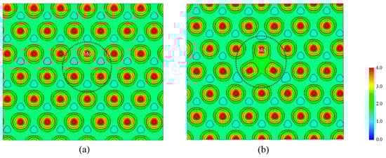 We also examined the electron densities of the Mo layer, which can reflect changes in the chemical bonds around the vacancies. Figure 9 compares the electron density of the Mo layer between intrinsic and sulfur vacancies of the monolayer MoS2. It can be seen from the figure that in the absence of sulfur in a symmetrical position in the MoS2 structure, the electrons near the vacancy are concentrated mainly in three adjacent Mo atoms. The high density of electrons gathered makes the three Mo atoms almost together. Also, a strong coulomb attraction is produced to the nearest Mo atom or S atom and that leads to the S–Mo bonds in the foreground becoming smaller. Compared with the perfect state, the electron distribution near the vacancy area is obviously localized and should be related to the formation of the defect level.