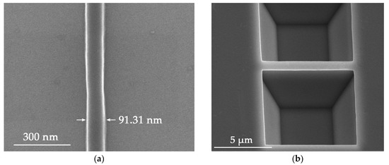 In order to obtain a feature size below 100 nm, EB resist ZEP 520 was employed as the etch mask for ICP. Electron beam lithography is suitable for nanoscale fabrication because of its excellent control precision. ZEP 520 is a common commercialized positive electron beam resist with the advantages of high resolution, vertical side wall and good etch resistance. In order to obtain nanowires with a good appearance, a group of experiments was carried out to optimize EBL parameters such as the resist thickness, the exposure dose and the line width. The resist was spun on the Si substrate with a thickness about 500 nm. The prebake was done under 180 °C for three minutes. Then, different wire widths were tried, as well as different doses of the electron beam. According to the design of the nanowire, the rectangular regions on both sides of the nanowire were exposed and developed. The nanowire was located in the middle and coated with resist. Figure 3a shows the details of the EBL patterned nanowire under high magnification, where the wire is about 90 nm in diameter, with a good line shape and smooth surface. These features indicate that the quality of the pattern is good enough for the following nanowire fabrication steps such as the ICP etching, where the resist will act as an etch mask.