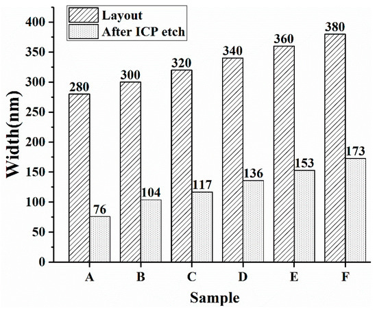 Based on plenty of experiments, we the change of nanowire width can be observed in Figure 4. Data in samples A to F were obtained from our experiments, indicating that the ICP-etched nanowalls are approximately 200 nm narrower than the layout geometry, which provides a reference for manufacturing size-controllable nanowires.