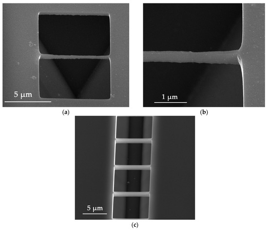 The bottom part of the nanowall has to be removed to obtain a suspended nanowire. After the ICP etching, the silicon nanowall structure was dipped into TMAH etching solution, which was able to etch the whole silicon wafer except the heavily boron-doped layer. This etch-stop technique definitely lowered the difficulty of making a suspended structure. According to Thong J.T.L. et al., the etch rate of a low-doped silicon wafer with (100)-orientation in 25 wt % TMAH reaches 1 μm/min at 80 °C, while it falls sharply for heavily doped silicon with a concentration greater than 4 × 1019 cm−3 [25]. When the boron-doping level reaches 1 × 1020 cm−3, the etching rate decreases to 10 nm/min for (100) facet, while the etch selectivity is up to 100 [23]. Hereby, for a 1020-nm-wide nanowall, it only takes about six seconds to etch through the bottom part. In fact, during our experiments, samples were etched in TMAH at 80 °C for three minutes to ensure the nanowire was able to be totally suspended. Figure 5a–c shows the released nanowall with different sizes. Figure 5a is a 7 μm long suspended structure, which shows a good uniformity, with 280 nm in height and 55 nm in width, as illustrated in Figure 5b. Experiments with 2- and 5-µm-long nanostructures were also successful, which indicates that nanowire structures with different lengths can be obtained by using the heavily boron-doped layer and its etch-stop character. For further demonstration, several parallel nanowire structures with the same length of 7 µm were released simultaneously. The result is shown in Figure 5c, where each nanowire shows almost the same etch effect such as the width and the height. Therefore, in the proposed method, nanostructures with regular shape and controllable size can be obtained. When this nanostructure is released in TMAH etch solution to obtain a suspended wire, the surface of the nanowire remains quite uniform. The height of the nanowire here is about 280 nm, which is a much larger value than the width, at 55 nm. However, it is reasonable to assume that a lower value could be obtained by shrinking the boron-doped layer thickness, which is our ongoing research work.