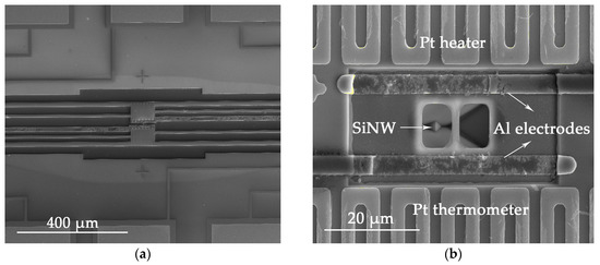 Images of the device are shown in Figure 6. Figure 6a presents a SEM image of the finished device structure, which includes connecting wires and two bimetal filaments deposited at both ends of the nanowire. Figure 6b shows the nanowire suspended between Pt serpentine resistances, with the two ends connected via Al metal electrodes, prior to the isolation trench etching process. Al metal electrodes were used for I-V measurements. It can be seen that Pt filaments are smooth and uniform. The line width of Pt filament is about 3 µm, and the occupied area is about 70 × 90 µm2. The isolation trench is clearly shown in Figure 6a.
