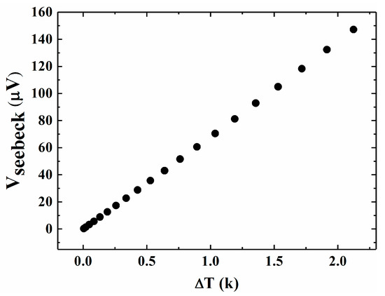 In Equation (3), is the temperature difference and is the Seebeck voltage. S is in the unit of μV/K. It was measured as follows. There were two bimetal filaments deposited at both ends of the nanowire, one served as heating resistor and the other served as a thermometer [27]. Constant current was applied on the resistor to generate the heat. Part of the heat was transmitted to the other end of the nanowire, causing a temperature difference (), which was indicated by the change in resistance [28]. Meanwhile, a Seebeck voltage () was induced [29,30], which was measured by a Keithley 2182A meter (Beaverton, OR, USA). The measurement was conducted at constant temperature to eliminate the influence of temperature variation of the atmosphere. Figure 7 shows the temperature dependence of the Seebeck voltage. By fitting the data, the Seebeck coefficient is 69.12 μV/K. As reported in Ref [14], for a Si nanowire with 50 nm in diameter and doping concentration of 1 × 1020 cm−3, the Seebeck coefficient reaches 100~120 μV/K, which is approximately two times larger. The main reason for this is probably that the diameter of the nanowire is not small enough to produce quantum confinement effects, which have an obvious influence on the Seebeck coefficient. Another reason is that the temperature difference between the two Pt filaments is larger than that of the nanowire, which results in smaller Seebeck coefficient.