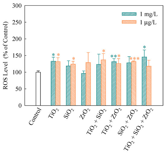 When intracellular ROS generate, 2′,7′-dichlorofluorescein (DCF) would be converted from DCFH, which was obtained by lipase decomposing DCFH-DA in cells [31]. Thus, FI of DCF indicates the extent of intracellular ROS generation. As shown in Figure 3, FI (%) of the ternary NP systems at the mixture concentration of 1 mg/L showed a significantly higher level (p < 0.05) than the control, indicating a significant increase in ROS. In addition, for the NP alone treatment, only TiO2 NPs significantly increased the ROS level. This implies that TiO2 NPs mainly contributed to the generation of ROS in the algal cells exposed to the ternary NP systems at the mixture concentration of 1 mg/L. Note that the binary NP systems at the mixture concentration of 1 μg/L significantly promoted the generation of intracellular ROS. Moreover, the individual TiO2 and SiO2 NPs at the concentration of 1 μg/L also accelerated an increase in the ROS levels in S. obliquus.
