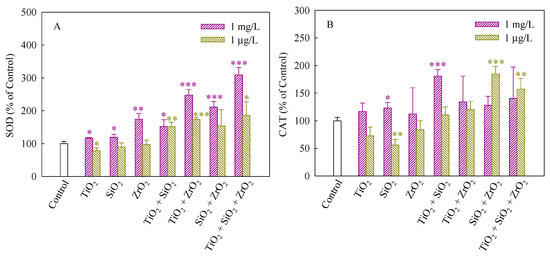 SOD and CAT can maintain steady-state levels of ROS in cells and protect cells against the adverse effects of them [32]. SOD dismutases superoxide anions (O2−) to hydrogen peroxide (H2O2), whereas CAT catalyzes the conversion of H2O2 to H2O [33]. Figure 4A,B depict the SOD and CAT activities of S. obliquus exposed to the NP suspensions from single to ternary mixture systems. As shown in Figure 4A, in comparison with the control, the SOD activity significantly increased when the algae were exposed to the single, binary and ternary NPs systems at the mixture concentration of 1 mg/L, demonstrating the production of O2− and an increase in ROS scavenging. Generally, the up-regulation of SOD levels was consistent with an increase in ROS induced in response to exposure to the studied systems. Furthermore, the SOD activity induced by the ternary NP systems showed higher than the single and binary NP systems, suggesting that the three NPs exerted a synergistic influence on the SOD activity. In addition, the studied systems at the mixture concentration of 1 μg/L also significantly enhanced the SOD activity when TiO2 NPs were present, implying that TiO2 NPs in the mixtures contributed to the SOD activity mainly. In Figure 4B, CAT in treated cells exposed to 1 mg/L SiO2 NPs and the binary systems of TiO2 and SiO2 NPs at the mixture concentration of 1 mg/L was present significantly higher levels than the control. Moreover, the CAT activity of the binary systems of SiO2 and TiO2 NPs and the ternary NP systems at the mixture concentration of 1 μg/L was also higher than the control. However, the SiO2 NPs alone remarkably decreased the CAT activity, indicating that the activity of the enzyme might be inhibited and a decrease in the activity of CAT resulted in an inefficient removal of H2O2.