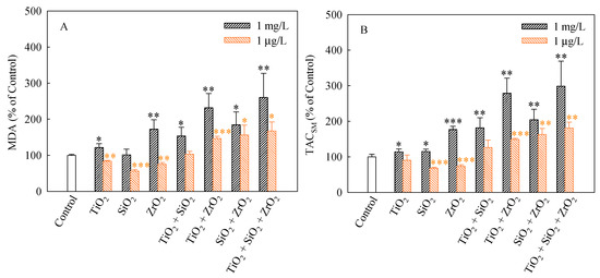 We used MDA and TACSM as oxidative stress markers to evaluate the non-enzymatic antioxidant activities of S. obliquus. MDA production usually correlates with the occurrence of peroxidation [34]. MDA is considered to be one of the major products of lipid peroxidation under stressed conditions and it is widely used to determine the degree of oxidative stress that has occurred [35]. The MDA levels (%) in S. obliquus cells after 96 h of exposure to the studied systems are shown in Figure 5A. The levels of MDA in the algae cells exposed to the single, binary and ternary NP systems at the mixture concentration of 1 mg/L with the exception of SiO2 NPs were higher than the control. Furthermore, the MDA levels caused by the ternary NP systems showed higher than the single and binary NP systems. Additionally, the binary systems of TiO2 and ZrO2 NPs, the binary systems of SiO2 and ZrO2 NPs and the ternary mixtures at the mixture concentration of 1 μg/L induced a significant increase in the MDA levels. Moreover, the MDA levels in the algal cells exposed to these mixtures were obviously higher than the single NPs.