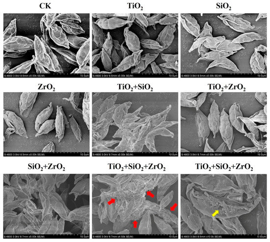Superficial structures of S. obliquus exposed to 1 mg/L of NPs alone, 1 mg/L of single NPs in binary combination and 1 mg/L of single NPs in ternary combination. CK represents control. The red arrow and the yellow arrow indicate cell-cell adhesion and cell defect, respectively.