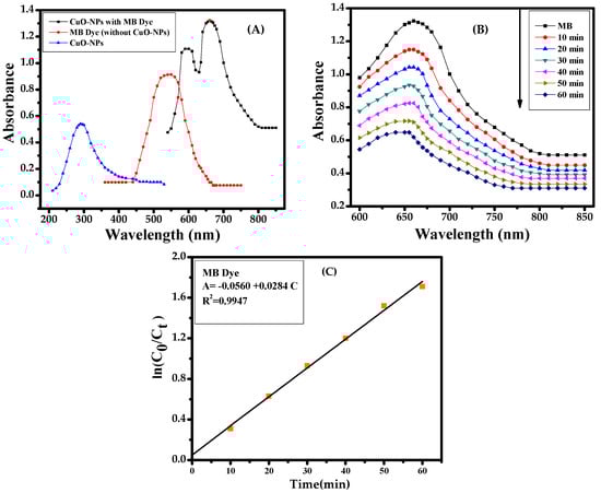 (A) UV spectra of methylene blue (MB) dye with CuONPs; (B) catalytic reduction of MB dye with CuONPs and (C) calibration plot of ln(C0/Ct) vs. time for the photodegradation of MB dye.