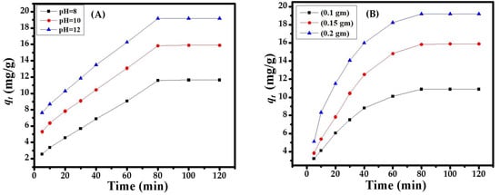 The great impact of pH on the adsorbent surface encourages the ionization of molecules or the diffusion of ions/functional groups on the active sites of the CuONPs adsorbent, maintaining the surface charge during the adsorption process. The variable pH (8, 10, 12) of the solutions was used in the sorption process and enhanced the sorption activity in a basic medium with pH 12.0. It can be seen in Figure 3A that the maximum and constant adsorption value was found at pH 12.0. An increase in pH increases the sorption capacity that reached a maximum point at 80 min Figure 3A, which is suitable and was selected for the overall experiments.