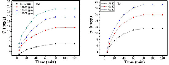 where qt (mg·g−1) is the amount of adsorbed dye per gram of adsorbent, C0 (ppm) and Ct (ppm) are the concentration in solution at time t = 0 and at time t, V is the volume of the solution (L) and ‘m’ is the mass of the adsorbent (g).
