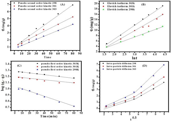 A plot of t/qt versus t gives the value of the constant Ks (g·mg−1·min−1); also, qe (mg·g−1) can be calculated. The descriptive values of the pseudo-second-order kinetics are as follows: Ks = 0.001454 g·mg−1·min−1, qe = 23.5183 mg·g−1, h = 1.2431 mg·g−1·min−1, R2 = 0.9995. The pseudo-second-order kinetic plot for dye adsorption at a concentration of MB dye of 153.52 ppm, adsorbent dose (CuONPs) of 0.10 g, pH of 12.0, equilibrium at 80 min, and temperature at 303 K, are shown in Figure 5A–D. The value of Kf = 0.0030 min−1 is a pseudo-first-order rate constant and Ks = 0.0014 min−1 is a pseudo-second-order rate constant but the sorption process follows pseudo second order. The Elovich equation—the value of α (2.634 mg·g−1·min−1) initial sorption rate—covers the extensive absorption sites in Table S2.
