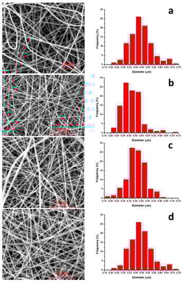 SEM analysis on the electrospun samples was performed with a LEO 1525 microscope. The fiber diameters were detected, in the SEM images, through one-by-one localization, using the software Sigma SCAN (Analyze Images Automatically) considering 500 fibers for every system (Systat Software Inc., San Jose, CA, USA). The use of the software “OriginLab” (Systat Software Inc., San Jose, CA, USA) allowed the evaluation of distribution of diameters for all systems.