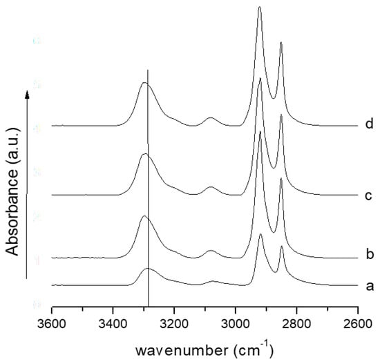 FTIR spectra for samples (a) PA11, (b) PA11/1.0 wt % HNTs–lysozyme, (c) PA11/2.5 wt % HNTs–lysozyme, (d) PA11/5.0 wt % HNTs–lysozyme.