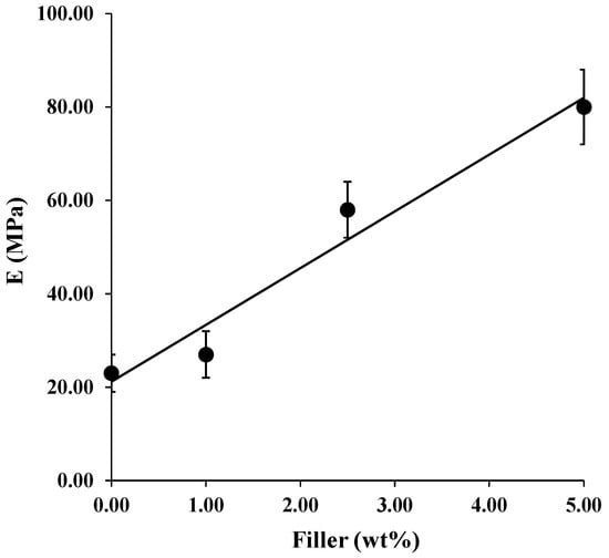 The mechanical properties, in terms of elastic modulus E (MPa), are reported in Figure 3 as a function of filler loading. In the case of composite systems, the enhancement of the mechanical properties of nanocomposites requires a high degree of load transfer between the continuous and dispersed phases. If the interfacial adhesion between the phases is weak, the filler behaves as holes or nanostructured flaws, introducing local stress concentrations, and its benefits on the properties are lost. The filler must be well dispersed, because in the case of poor dispersion, the strength is significantly reduced. The modulus linearly increases with HNTs–lysozyme in all the investigated composition range. The improvement of this parameter can be attributed to the presence of HNTs that act as reinforcing agents for the polymer matrix, well dispersed into the polymer at any composition. Data are reported in Table 1.