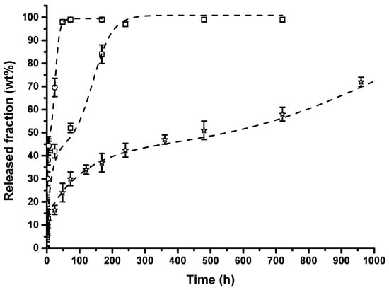 Released fraction (wt %) as a function of time (hour) for samples: (◯) PA11/1.0 wt % HNTs–lysozyme, (☐) PA11/2.5 wt % HNTs–lysozyme, (☆) PA11/5.0 wt % HNTs–lysozyme.