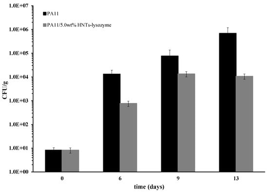To simulate the meat storage in the field of large food distribution, we put the prepared membranes as pads inside petri dishes of 4 cm diameter. The filled petri dishes were covered with food grade cellophane film. Figure 5 reports the values of CFU/g of Pseudomonas for samples evaluated at 6, 9, and 13 days of storage at 4 °C. A pad made of unfilled PA 11 was used as reference. The starting bacterial count is quite low and after six days, had increased by four orders of magnitude for the membrane pad of PA11 and two orders of magnitude for the pad made of composite filled with 5 wt % of HNTs–lysozyme. The bacterial count increases with the time, being always lower for the sample put on the composite material. It is interesting to note that a plateau value is reached for the sample PA11+ 5 wt % HNTs–lysozyme, one order of magnitude lower than the PA11 at 13 days.