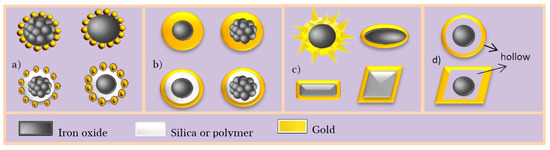 Main engineered structures of Fe3−xO4-Au Nanostructures (FANSs): (a) core-satellites; (b) spherical core-shell; (c) non-spherical core-shell and (d) hollow structures.