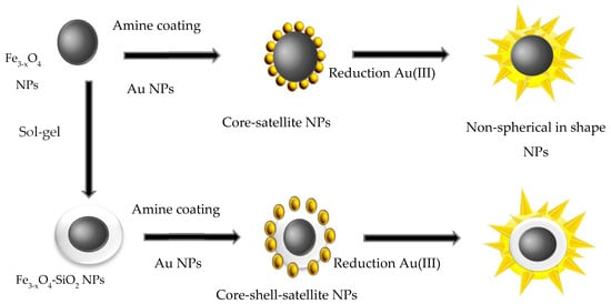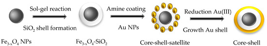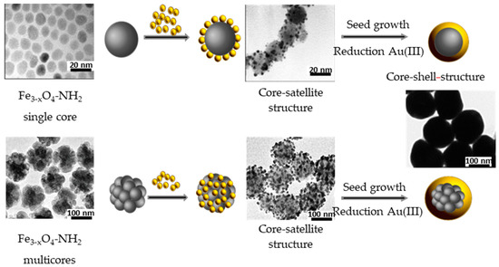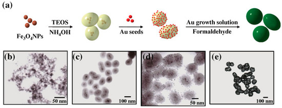 The preparation of FANSs may also proceed by a chemical deposition process involving the direct reduction of dissolved Au(III) species onto the Fe3−xO4 surface according. In this case, two different chemical pathways may be followed. In a first one, the formed satellites act as nucleation points (seeds) for the subsequent continuous metallic layer growth, using formaldehydes [10,42], N,N-dimethylformamide (DMF) [40], NaBH4 [35], among others, as reducing agent. This method requires several steps but it allows the control of the Au shell morphology. Alternatively, iron oxide NPs can be first coated by silica, before the gold seeds attachment and the further continuous gold shell growth. Huang et al. [49] prepared, for instance, Fe3O4 multicores embedded in a SiO2 matrix by the Stӧber method (Figure 4). Then, they functionalized the outer silica layer by 3-aminopropyltrimethoxysilane (APTMS), which electrostatically interacted with negatively charged preformed gold NPs. At the end, they used the as-produced products as platforms for gold shell growth via an in-situ reduction of chloroauric acid precursor by formaldehyde reagent.