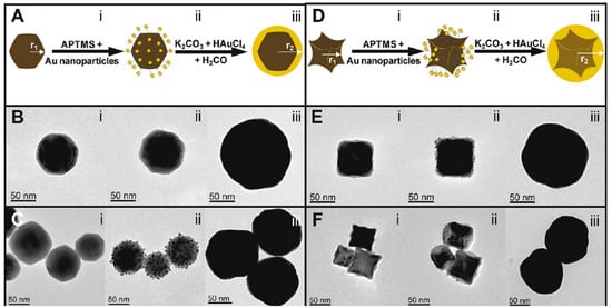 Schematic overview of the gold coating of (A–C) faceted and (D–F) tetracubic iron oxide cores. Representative TEM images of (i) the starting iron oxide cores; (ii) the decorated ones by Au precursors; and (iii) the coated ones by a continuous Au shell are given for illustration. Reproduced with permission from [50]. American Chemical Society, 2009.