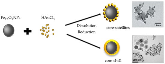 In the second route, called also one-step route, the Fe3−xO4 surface is directly coated by a gold layer [51,52]. This implies that Au atoms are directly deposited onto Fe3−xO4 through the reduction of Au(III) precursors (Figure 6). The basic principle for the formation of the gold shell is that Fe3−xO4 core surface must be appropriately charged to attract the dissolved molecular Au(III) precursors. This method can be accomplished in the absence of surfactant and completed in a one single step, but it does not allow a simple control of the final morphology of the built heterostructures.