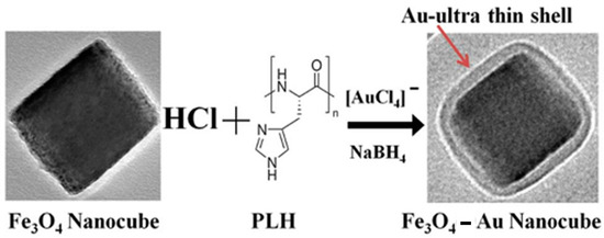 Schematic representation of the synthesis of Fe3O4-Au core–shell nanocubes, starting from monodisperse hydrophobic magnetic nanocrystals, coated with poly-l-histidine (PLH). The simultaneous addition of gold precursors and reducing reagents leads to the formation of a thin and continuous gold layer on the core nanocubes. Reproduced with permission from [59]. Royal Society of Chemistry, 2013.