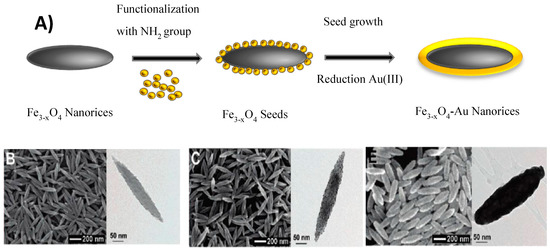 Halas’ group also reported the synthesis of Fe3−xO4-Au core-shell nanorices, starting from anisotropic in-shape iron oxide core and using the seed-mediated method. Fe3−xO4 nanorices with a longitudinal diameter of 340 nm and a transverse diameter of 54 nm were prepared by heating FeCl3 and potassium dihydrogen phosphate. Their surfaces were then modified by NH2 groups using APTMS. Gold seeds adsorbed on their surface played the role of nucleation sites for the further growth of the gold shell. At the end, Au shells of 10–30 nm in thickness were formed around the Fe3−xO4 rices, thanks to the reduction of HAuCl4 by formaldehyde in the presence of the seeds. The formation of Au shell preserved the anisotropic shape of iron oxide cores, leading to plasmonic properties in NIR region (Figure 8).