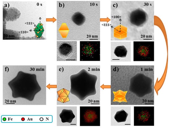 TEM images of Fe3O4-Au NPs and their elemental analysis (spot-mapping) for different reaction times: (a) 0; (b) 10 s; (c) 30 s; (d) 1 min; (e) 2 min; and (f) 30 min. Iron appears in green, gold in red and nitrogen in white. Reproduced with permission from [65]. American Chemical Society, 2014.