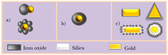 Some structures of Au-Fe3−xO4 Nanostructures (AFNSs): (a) dumbbells and core-satellites; (b) spherical core-shell and (c) non-spherical core-shell.