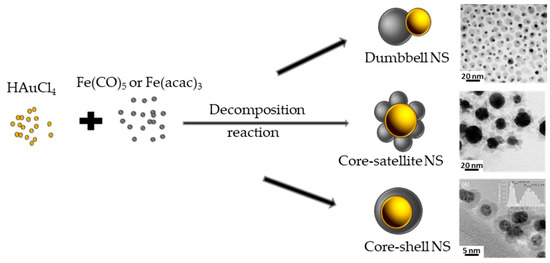 The two-steps method, called also modified seeded-growth, is like the seeding growth described previously for FANSs. In this approach, pre-synthesized Au NPs were used as seeds and were introduced into the reaction mixture, containing iron precursors. The growth of Fe3−xO4 onto Au surfaces occurred after the thermal decomposition of the iron precursors [69,75,76,77]. The growth of Fe3−xO4 depends on many parameters including the nature and the concentration of the iron precursor, the nature and concentration of the surfactants, the solvent polarity, the seed-to-precursor ratio, the temperature rate, the time for each heating plateau, etc. The polarity of solvents is a key parameter [78] since in a non-polar solvent, Au NPs are more negatively charged, preventing iron oxide nucleation and/or growth on their surface, after iron precursor, mainly Fe(CO)5, decomposition. As a result, a single site nucleation was obtained per Au particle to form dumbbell NSs. In polar solvent, the total negative charge of Au NPs decreases, permitting a multiple site nucleation of Fe3−xO4 on their surface and leading thus to the formation of core-shell structures (Figure 13).